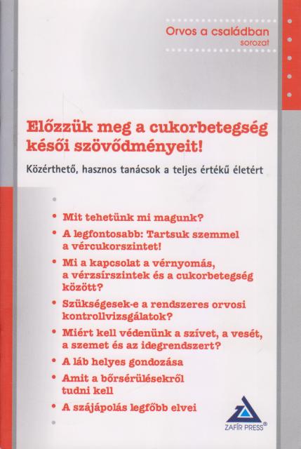 A cukorbetegség diagnózisával a beteg élete gyökeresen megváltozik. Állandó kezelésre van szüksége, át kell alakítania étrendjét, életébe napi többszöri vércukormérést kell beépítenie. Legyenek azok a szürke hétköznapok, a vakációk vagy a családi ünnepek, mindent meg kell tennie azért, hogy vércukorszintje a kellő határértékek között maradjon. Mindez sok-sok odafigyelést, olykor lemondást, s talán még több akaraterőt követel. Olykor nagy a kísértés, hogy felrúgja az új szabályokat, ha semmilyen panaszt nem tapasztal, csupán a vércukormérő, vagy a laborlelet mutatja, hogy az érték nem stimmel. A betegség késői szövődményei alattomosan alakulnak ki, sokáig nem okoznak tüneteket. Ne várja meg, amíg az ajtóban kopogtatnak, hiszen az orvostudomány modern eszköztára a beteg együttműködésével karöltve hosszú évtizedekre teljes értékű, szövődményektől mentes életet biztosíthat, valamint van mód arra is, hogy a már kialakult szövődmények előrehaladásának ütemét lassítjuk vagy akár megállítsuk. Kiadványunk célja, hogy a betegség késői szövődményeiről közérthető információval, megelőzésükről sok-sok hasznos tanáccsal szolgáljunk, amelyek birtokában a cukorbetegek tudatosan tehetnek meg mindent egészségük védelméért.